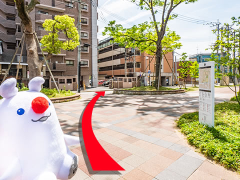 六本松交差点の旧制福岡高等学校跡にある、銅像を目印に右に曲がります。
